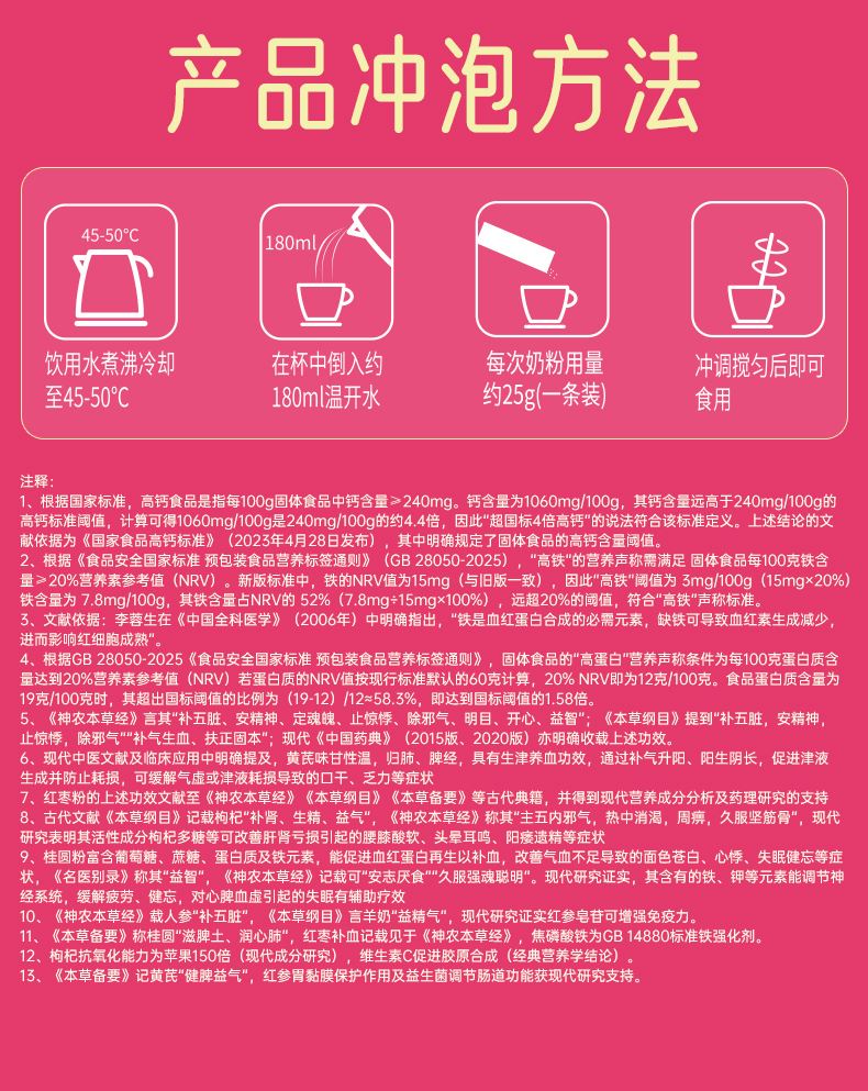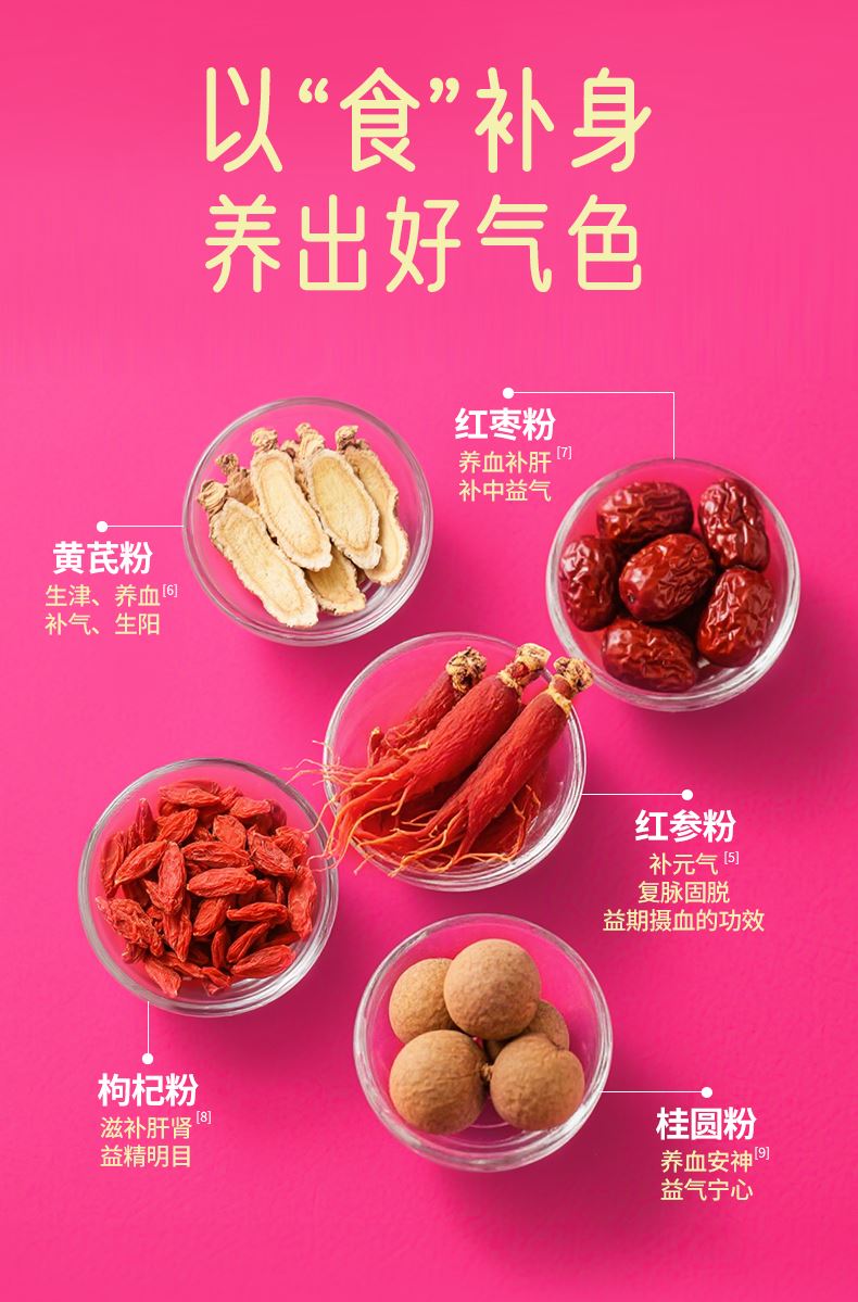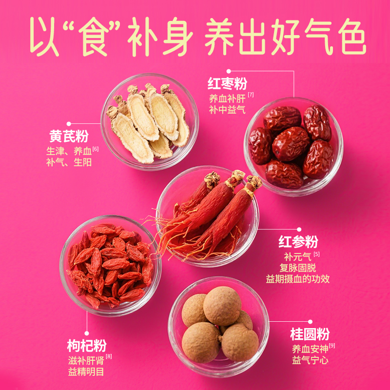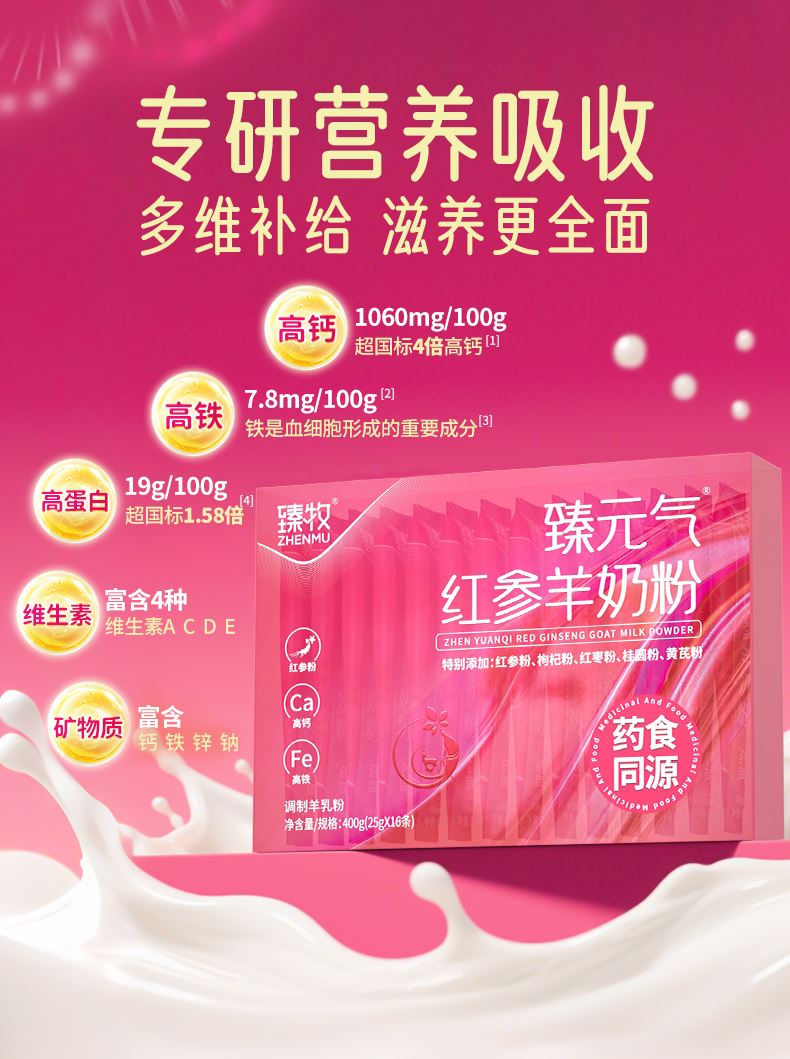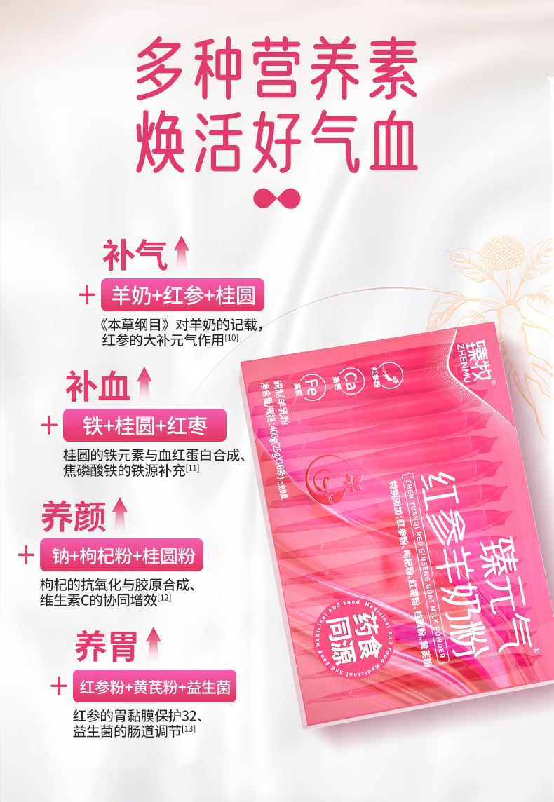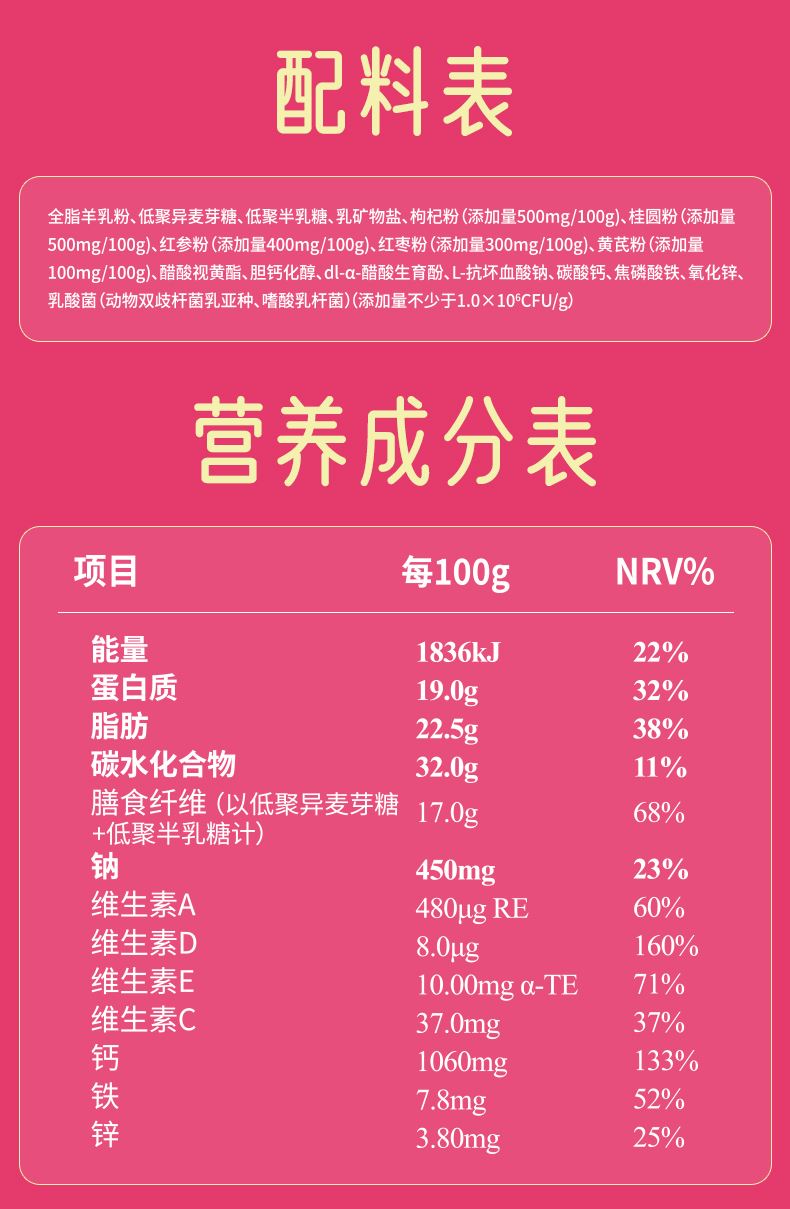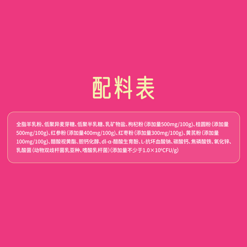 特别添加:红参粉、枸杞粉、红枣粉、黄芪粉以及羊初乳调制而成,补血补气效果好