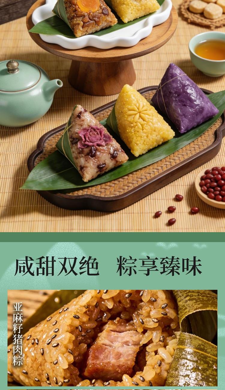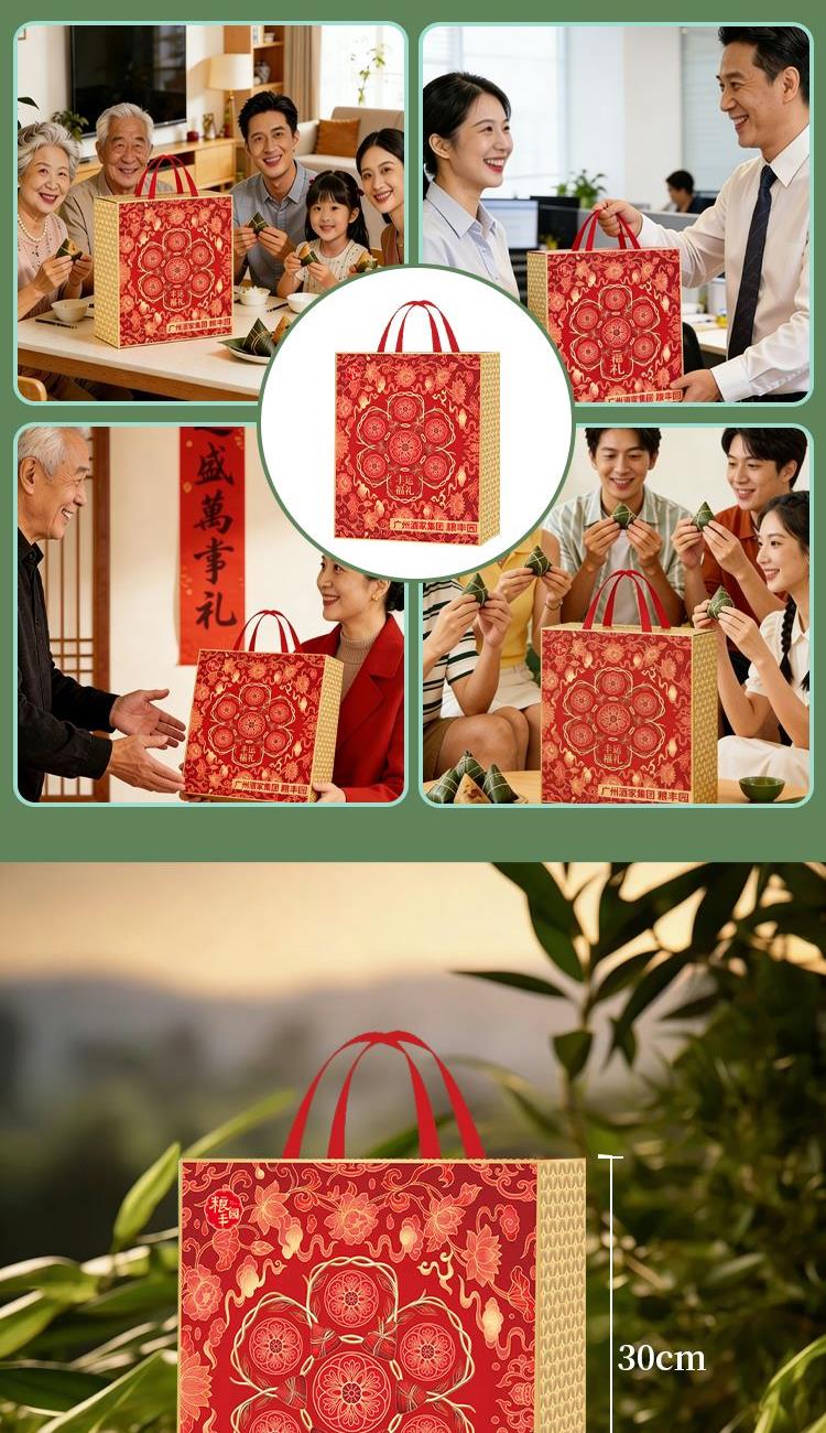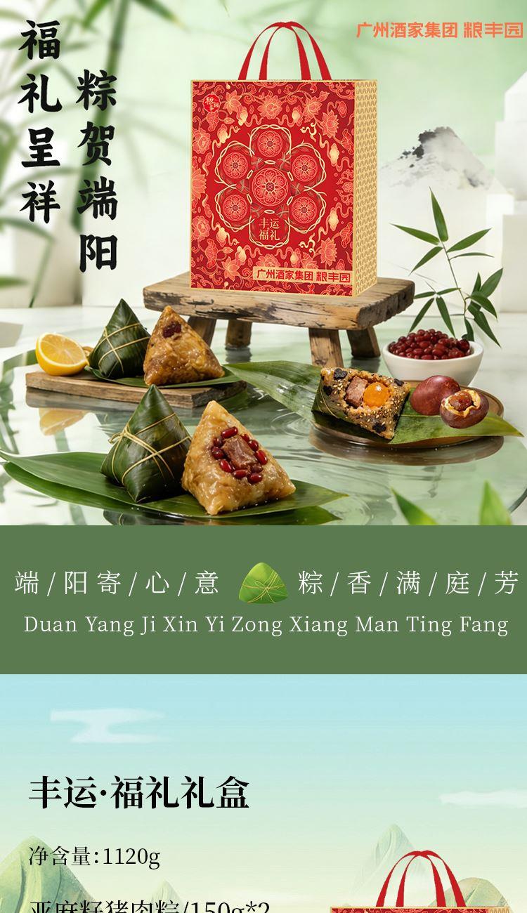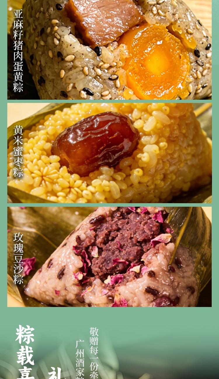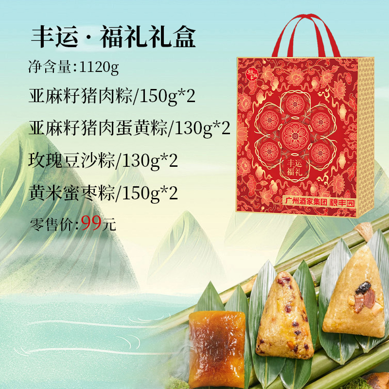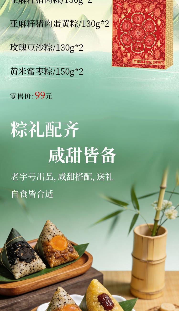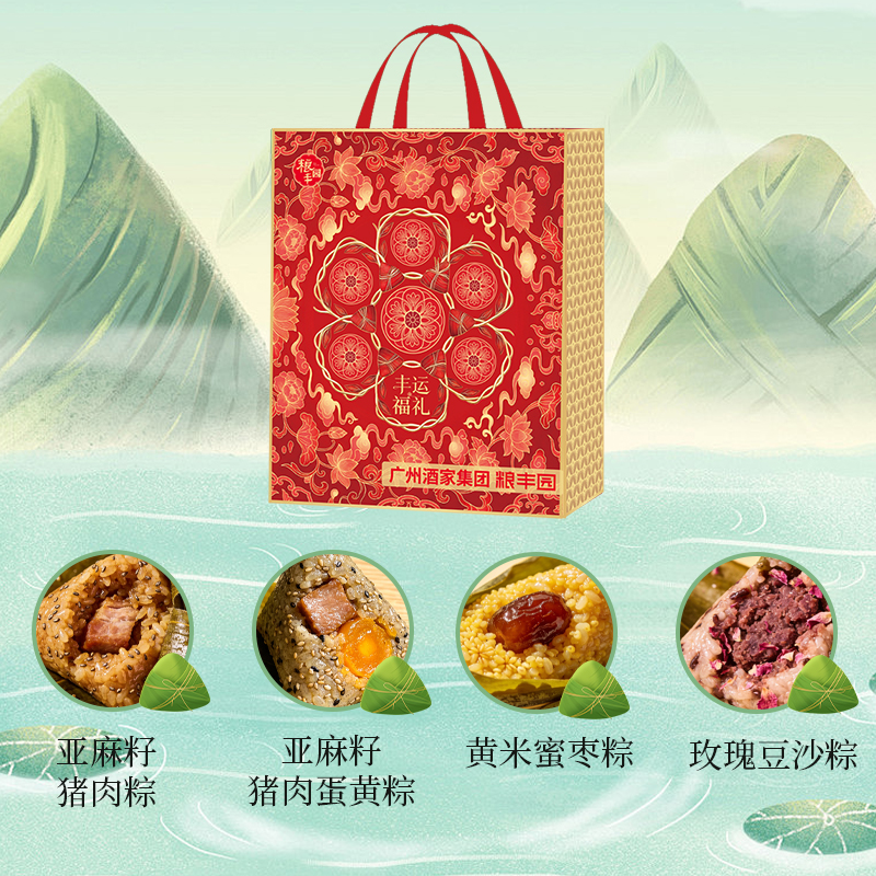 礼盒尺寸:24.5*30*9.5 内容物: 亚麻籽猪肉粽/150g * 2 亚麻籽猪肉蛋黄粽/130g * 2 玫瑰豆沙粽/130g * 2 黄米蜜枣粽/150g * 2 规格:1120g 保质期:9个月 百年广府,地道粤味,广州酒家 非遗匠心,粤菜标杆,国民品质之选 一席岭南风味,四季匠心好礼,认准广州酒家