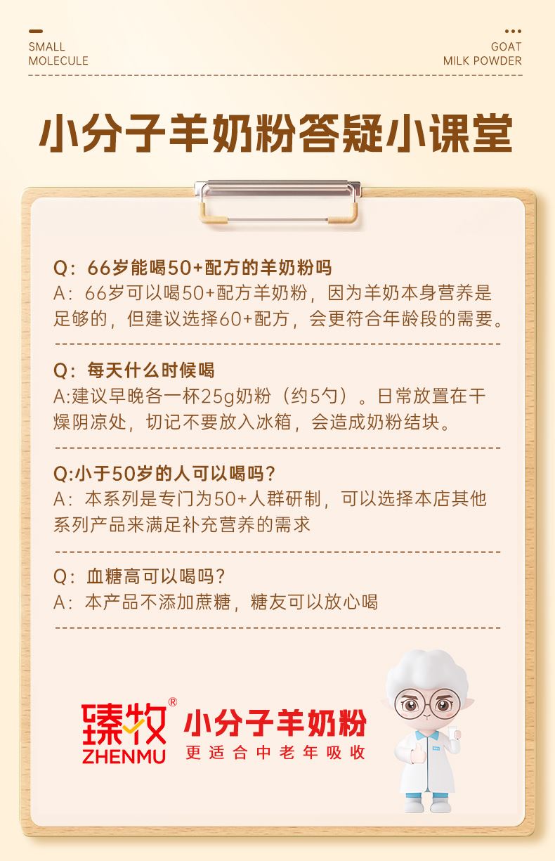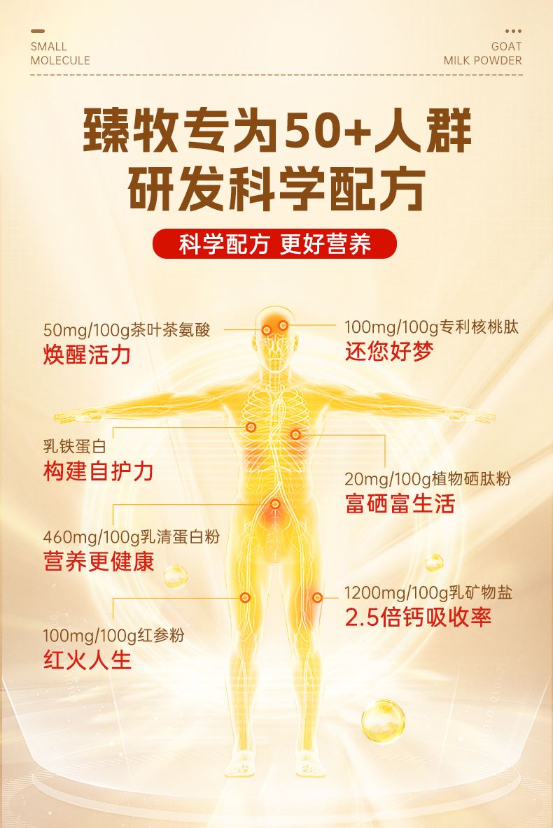 1、臻牧与西安交通大学合作创立小分子羊奶粉研究中心 2、羊奶脂肪颗粒小于牛奶,且羊奶蛋白质比牛奶更易被肠道消化吸收 3、10种益生菌,双专、利菌,双益生元,改善肠道菌群 4、天然乳钙,带来2.5倍钙吸收率,3倍钙含量,钙补进骨子里 5、第三代植物硒,高达90и收率,带来生命新“硒”望