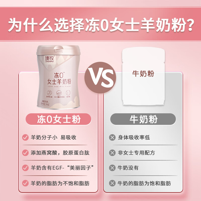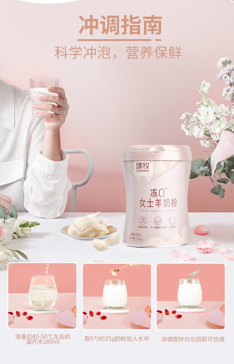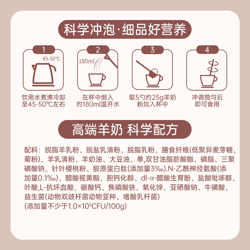 1、每杯冻0热量仅≈一个苹果 2、新款脂肪含量减少14热量减少7% 3、特别添加胶原蛋白肽和燕窝酸,挑战元气少女感 4、羊奶自带EGF上皮细胞生长因子,并有多种益生菌添加 5、独立条装方便携带,出门出差冲泡也方便
